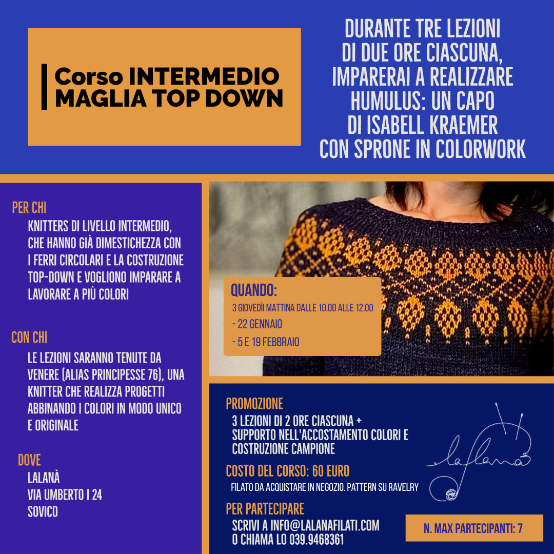 Per la scelta del filato e la realizzazione del campione potete passare da Lalanà a Sovico prima dell'inizio del corso.